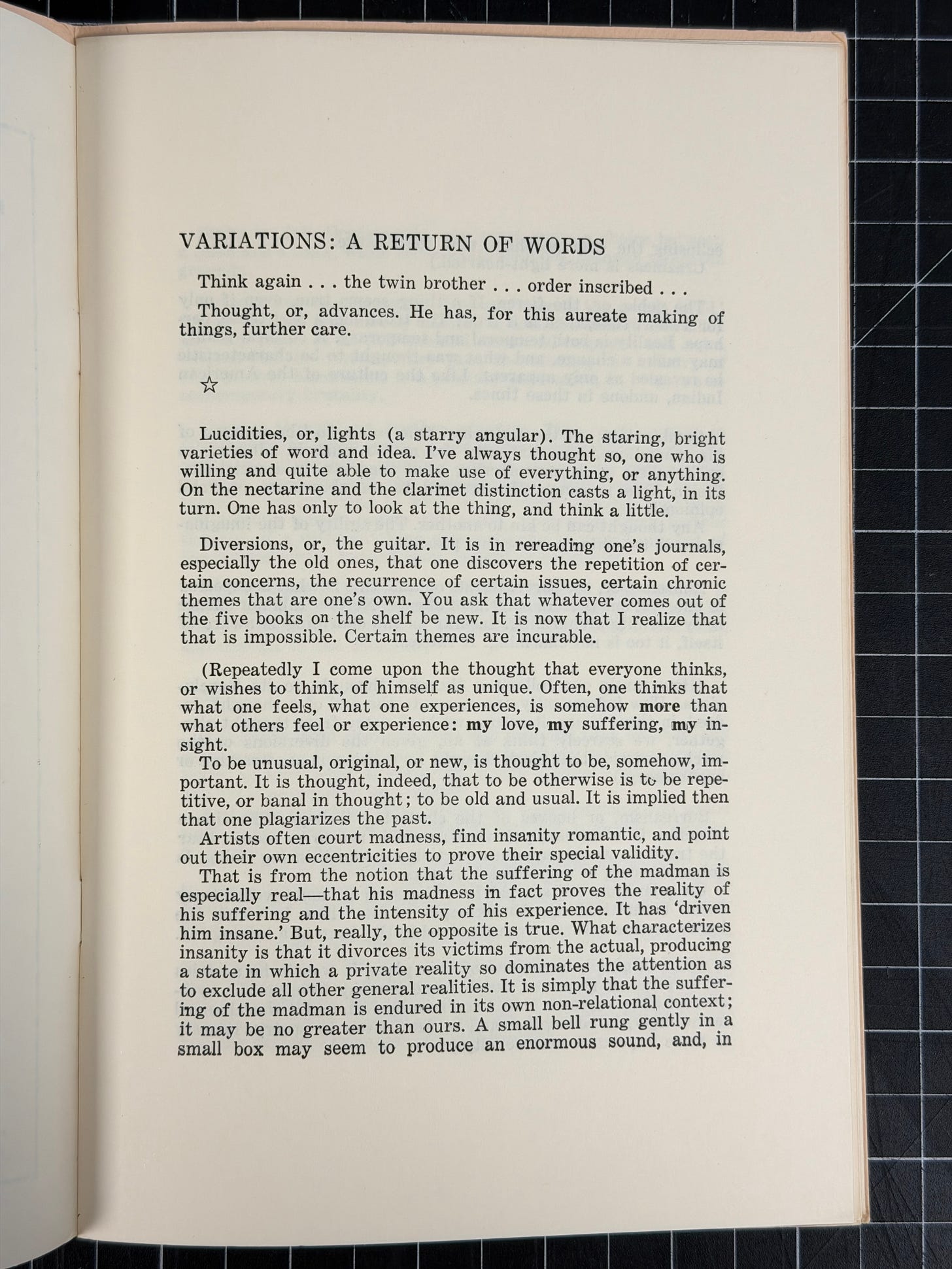 “Diversions, or, the guitar. It is in rereading one’s journals, especially the old ones, that one discovers the repetition of certain concerns, the recurrence of certain issues, certain chronic themes that are one’s own. You ask that whatever comes out of the five books on the shelf be new. It is now that I realize that that is impossible. Certain themes are incurable.”
